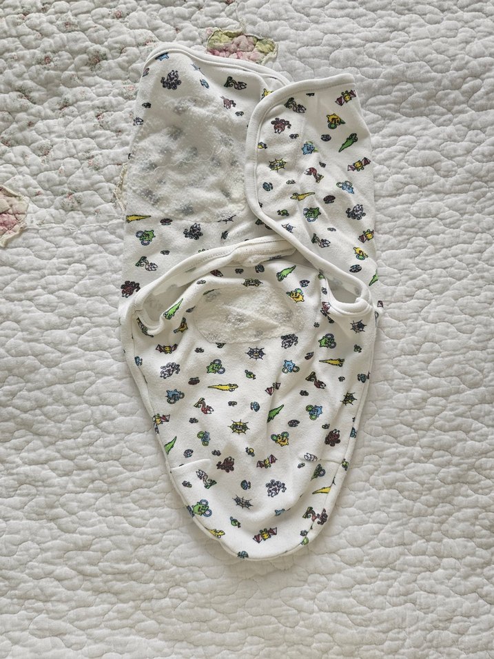 Yumuşak beyaz kumaş üzerinde renkli desenlere sahip, sıcak ve konforlu kundak