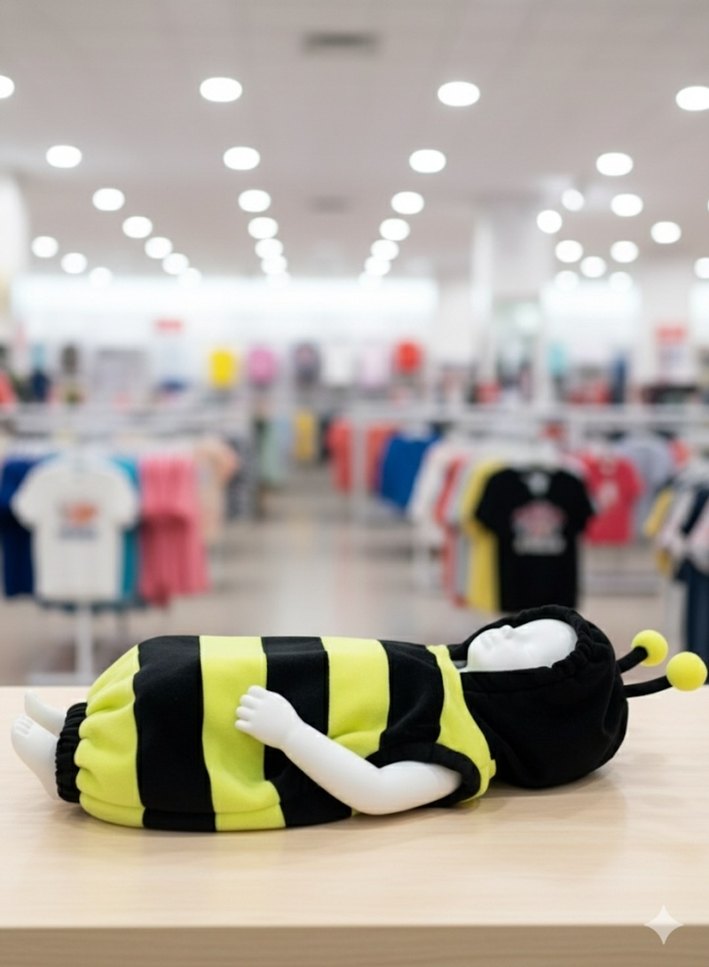 Renkli, sarı-siyah çizgili arı antenleri ve kuyruğu olan polar kadife karışımı bir kostüm veya kundak olarak kullanılabilir.