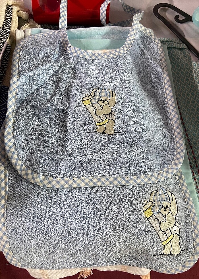 Banyo havlusu , küçük önlük , büyük önlük , ağız bezi , omuz örtüsü, banyo kesesi 5 li set hepsi nakışlıdır 0 ürün paketlidir.