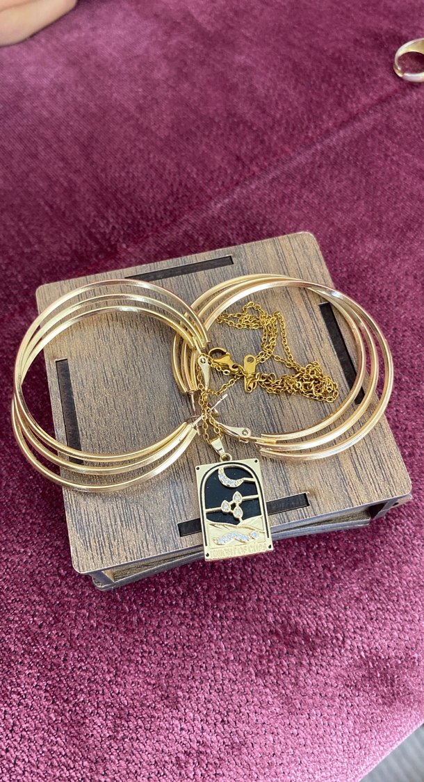 Parlak altın renkte, uzun zincir detaylı ve baskılı kolye ucu bulunan bohem tarzda kolye. Romantik akşamlar için uygun.yanındada küpe çelik gold