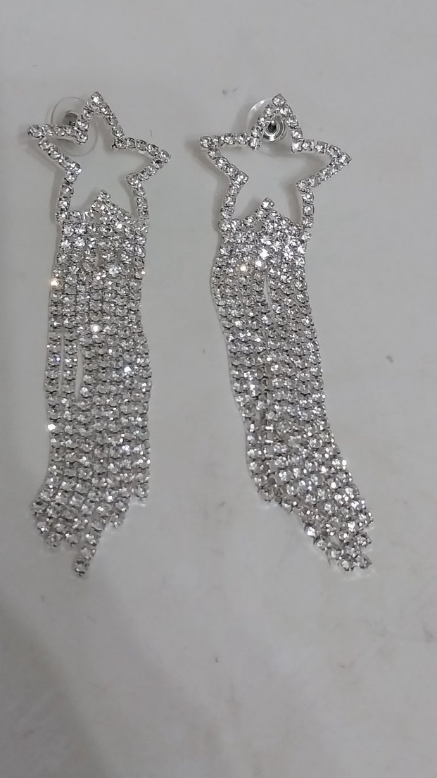 Gri işlemeli yıldız şekilli, parlak püsküllü küpe düğün gibi özel anlar için uygun.