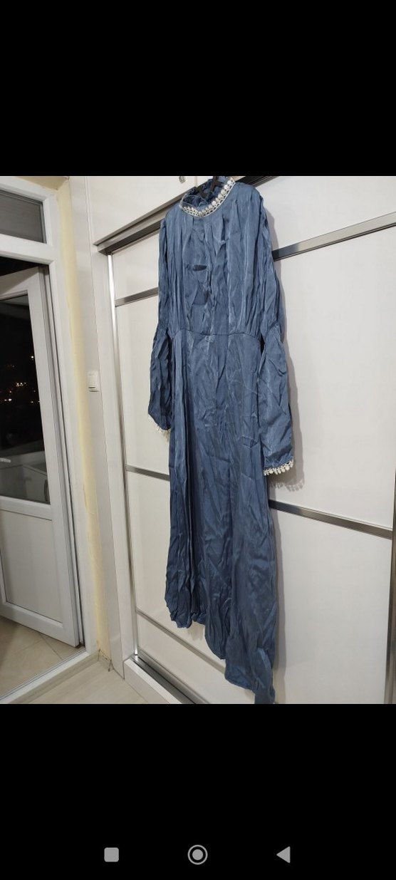 Bu lacivert uzun keten elbise, yüksek yakalı ve uzun kollu, nakış detaylarıyla bohem tarzda, bol kesimli ve drapeli Özel gün için. Ürünü mezuniyetimde giydim sadece. Özel dikim olduğu için küçük dikiş hataları var sadece kupra kumaş olduğu için. En sonra dikiş hatası var. Sadece kumaşı bana 1800 TL patladı.