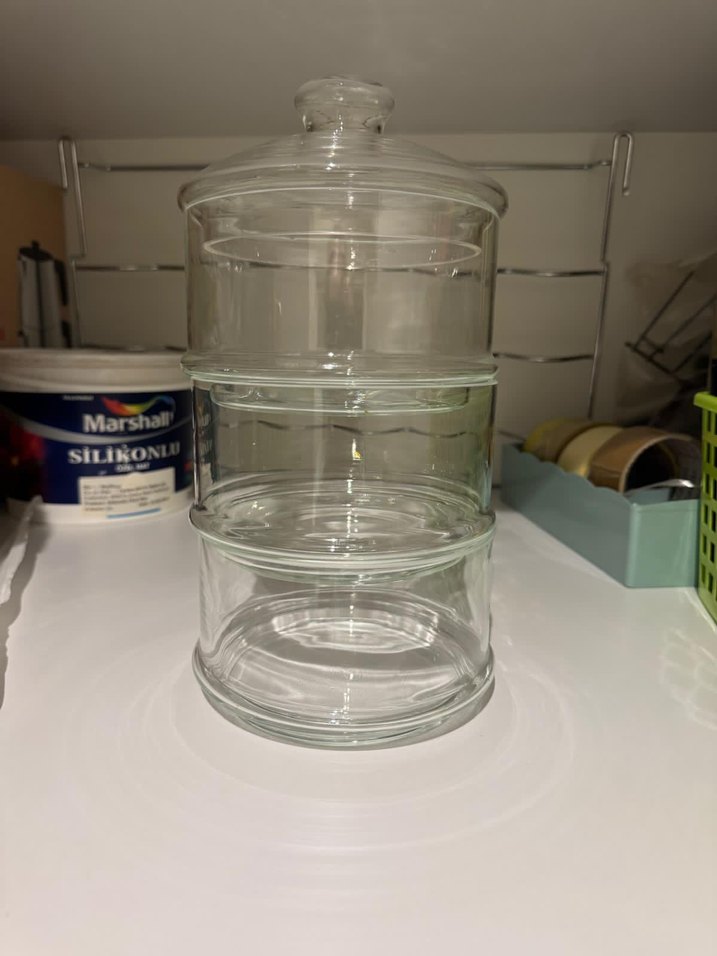 Kapaklı, çok katmanlı beyaz cam saklama kabı, mutfakta düzenli kullanım için uygundur. ️