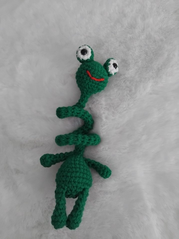 Yeşil renkli, spiral gövdeli ve büyük gözlü el örgüsü peluş oyuncak, yumuşak iplikten yapılmıştır.