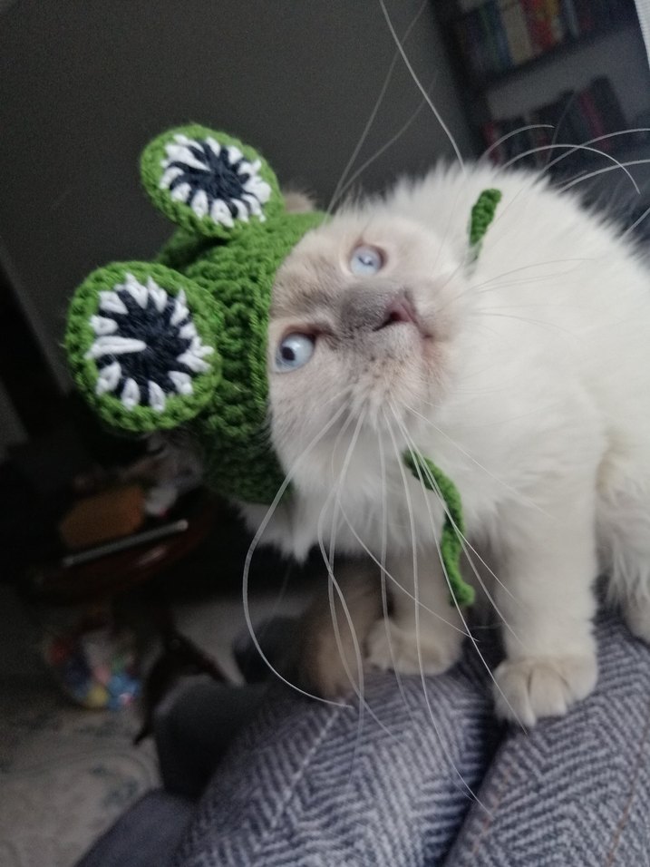 Kurbağa gözlü örgü kedi şapkası, evcil hayvanınızın görünümüne eğlenceli bir dokunuş katar.