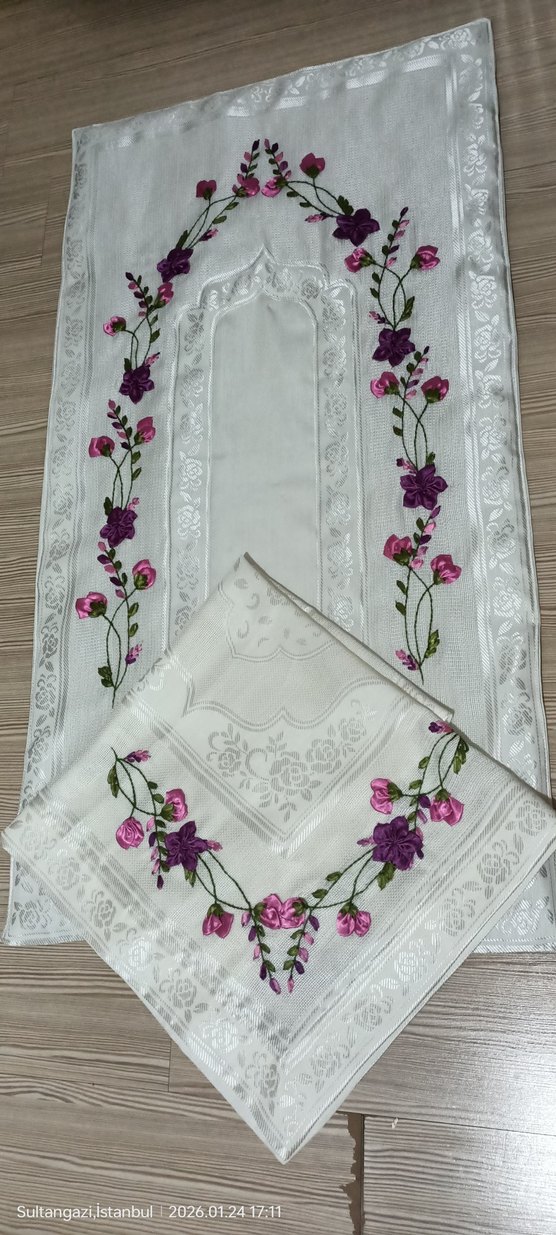 Mor ve pembe çiçek işlemeli beyaz seccade ve örtü seti, zarif geleneksel desenlerle süslenmiş. 1.kalite SARRA SECCEDE SETİ.. 1 SECCADE +1 BOHÇA + 1 YÜZ HAVLUSU+1MUTFAK HAVLUSU