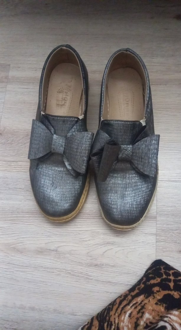 Gri renkte, büyük kurdele detaylı, düz tabanlı kız çocuk babetleri. Günlük kullanıma uygun, çağdaş ve rahat tasarım.