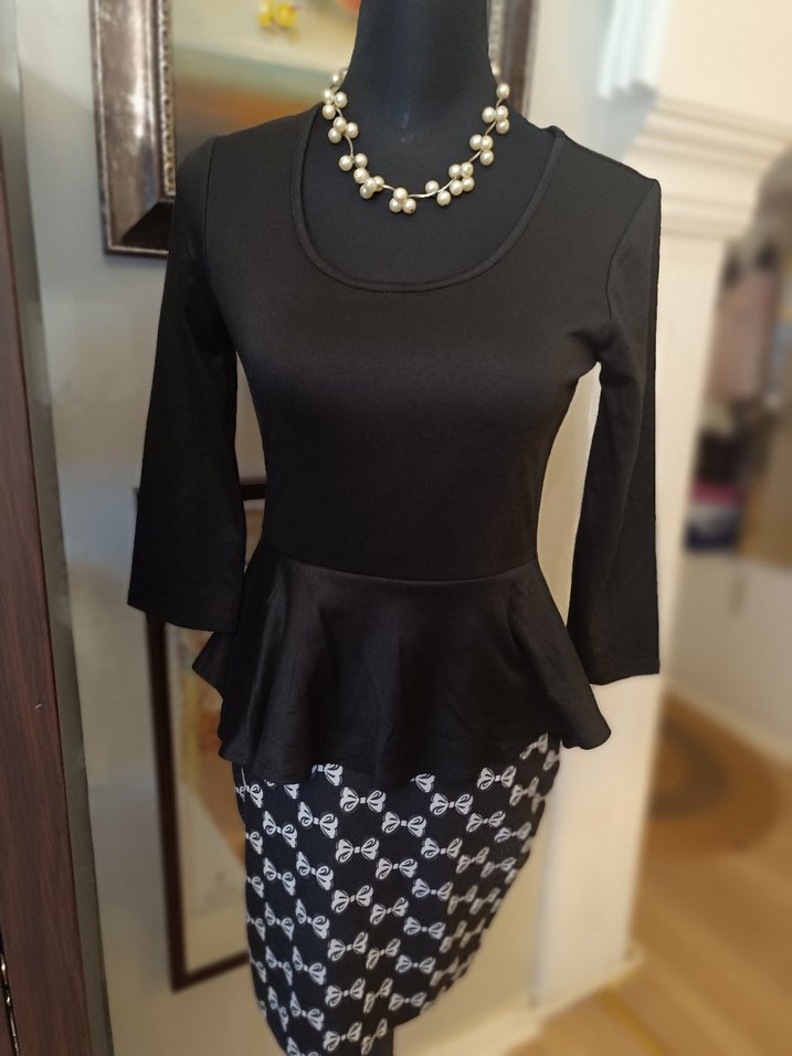 Uzun kollu, kurdele detaylı siyah midi elbise, baskılı etek kısmı ve yuvarlak yaka ile ofis için uygun, trend gotik stilinde.