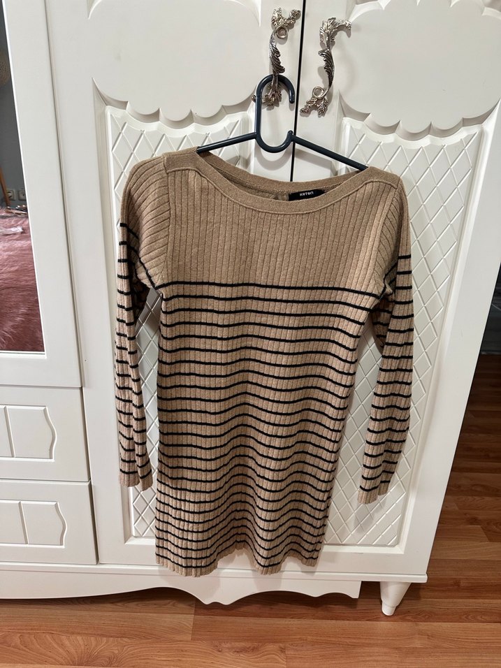 Uzun kollu, bisiklet yakalı, kahverengi ve siyah çizgili triko kumaştan yapılmış, vücuda oturan kadın elbisesi arkasında kurdele detayı var harika bi elbise. Rahat ve şık bir sokak giyimi parçası.