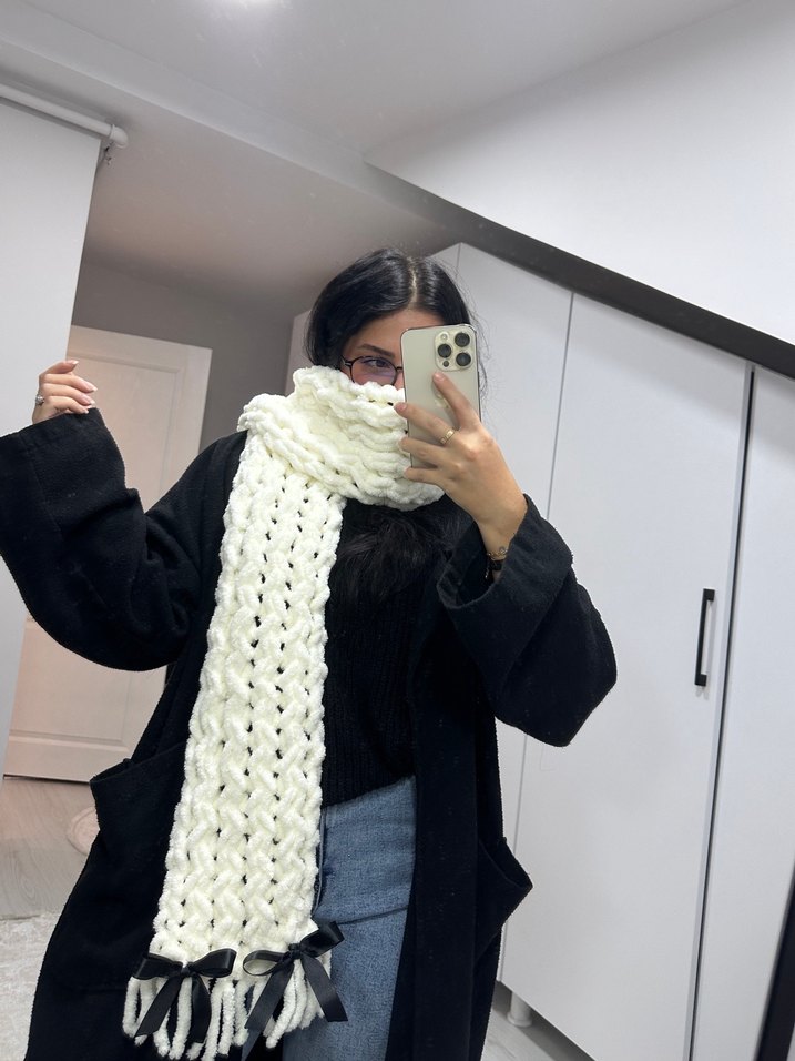 Ekru örgü kadın atkı, kalın örgü deseni ve püskül ile siyah kurdele detaylarına sahiptir, rahat ve trend sokak tarzı için uygundur.