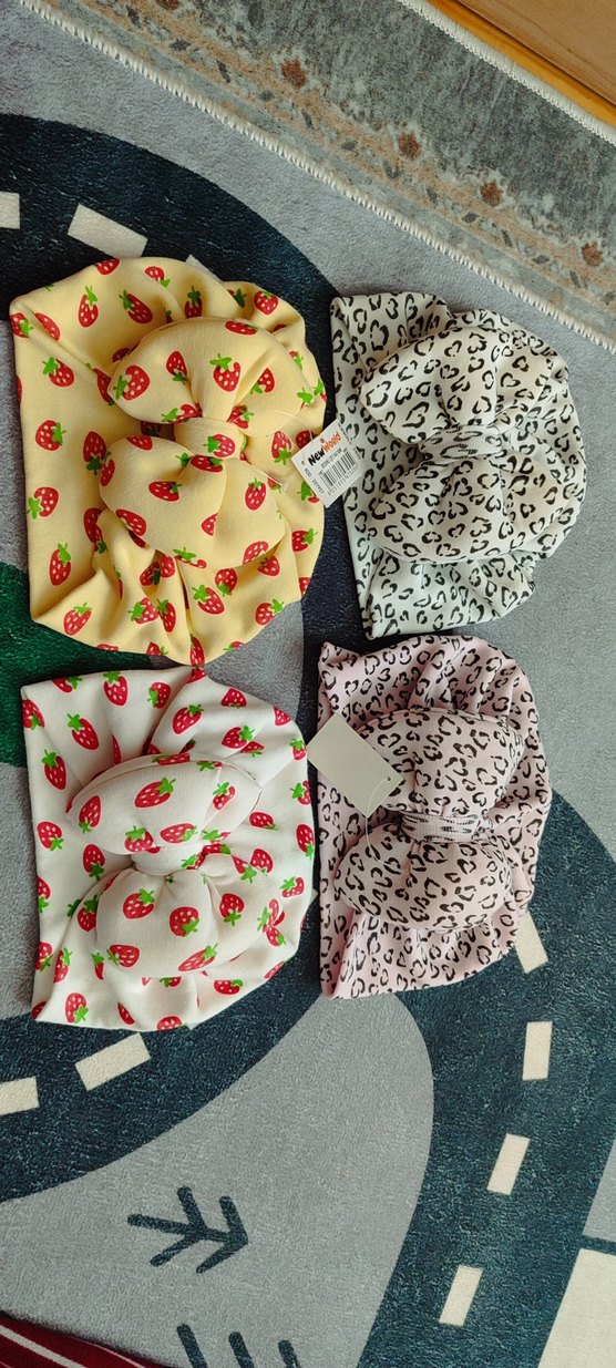 Yumuşak sentetik kumaştan, renkli bohem tarzda çocuk fularları ve bandanalar. Fırfırlı detaylar ve çilek ile leopar desenleri içerir.