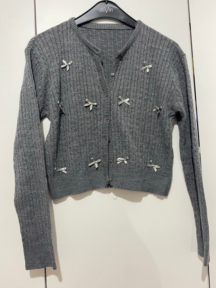Nakışlı fiyonk detaylı, uzun kollu, gri triko kadın hırka, normal boyda ve dar kesimdir. Hiç giyilmedi etiketi yok.