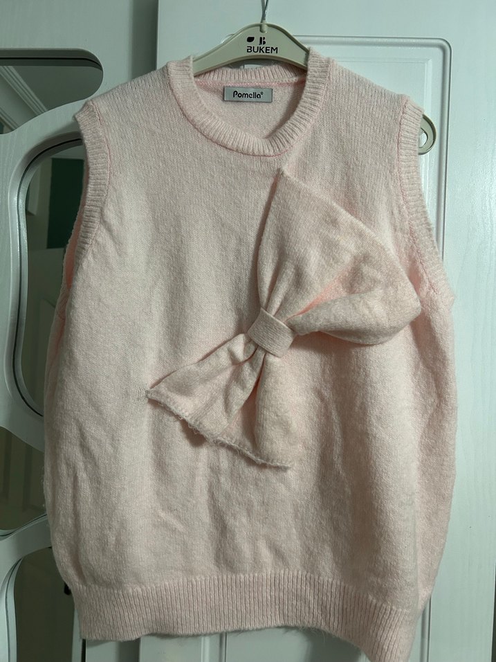 Pastel pembe renkli, yuvarlak yaka, örgü dokulu, kolsuz ve bol kesim kadın süveter. Midi uzunlukta ve önünde dekoratif fiyonk detayı bulunur.