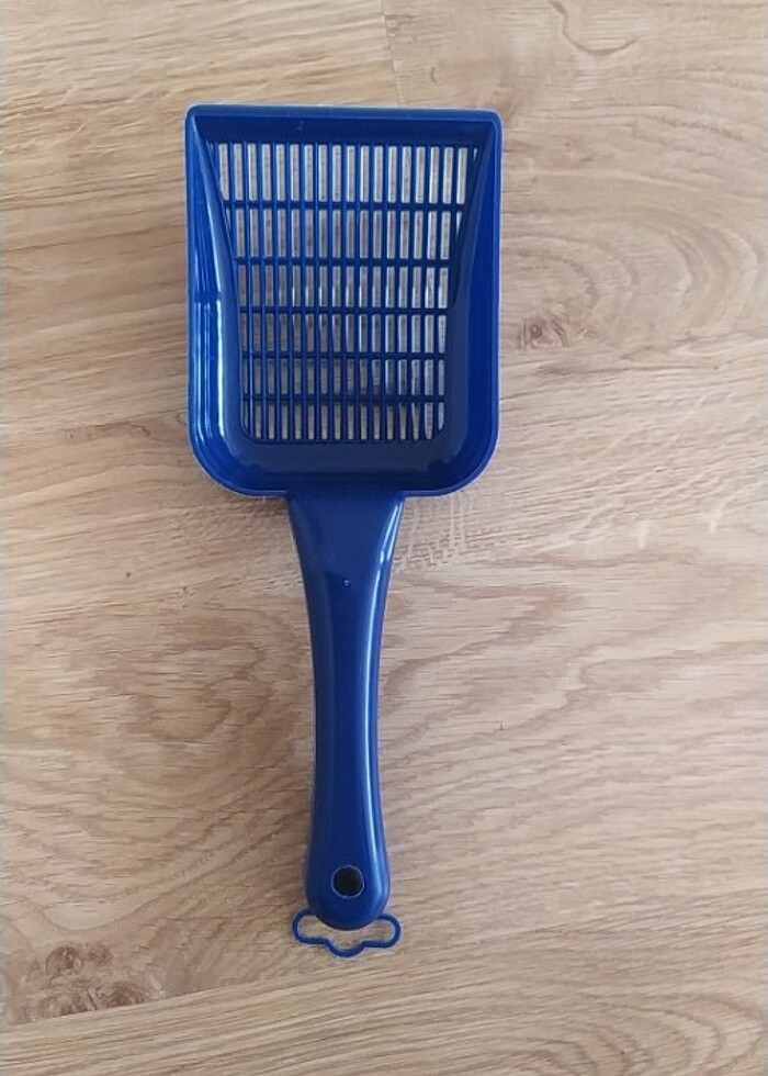 Evcil hayvanların tuvalet kaplarindaki kumu temizlemek için elekli kürek.