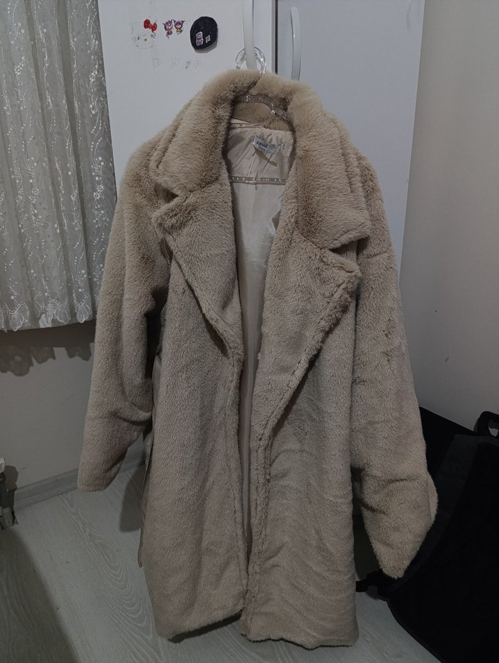 Bej renkli, uzun ve bol kesim kadın kaban. Yumuşak ve sıcak kumaştan, kürk detaylı, yakası çıtçıtlıdır. Günlük kullanıma uygun, desen içermeyen rahat bir sokak stili kaban.