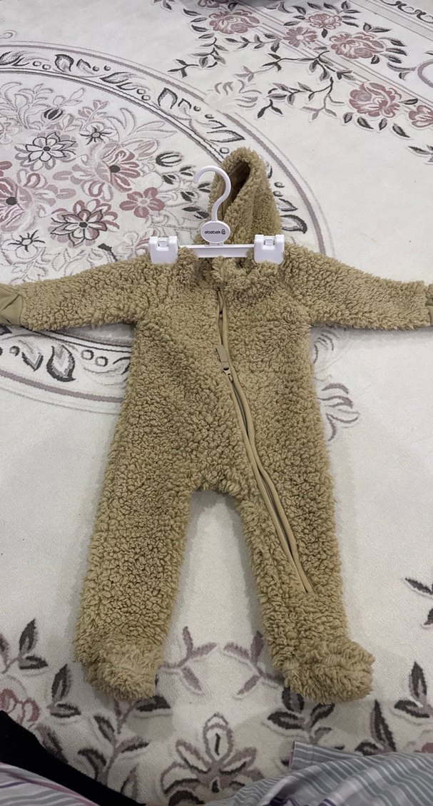 Kahverengi, yumuşak ve sıcak kumaştan yapılmış, kapüşonlu ve kürk detaylı bebek tulumu. Desensiz ve günlük kullanıma uygun.