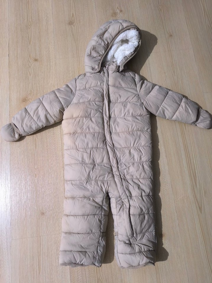 Kürk detaylı kapüşonlu, bej renkli bebek tulumu. Düz desensiz, notched lapel yakalı ve tam fermuarlı, sıcak tutar. ❄️