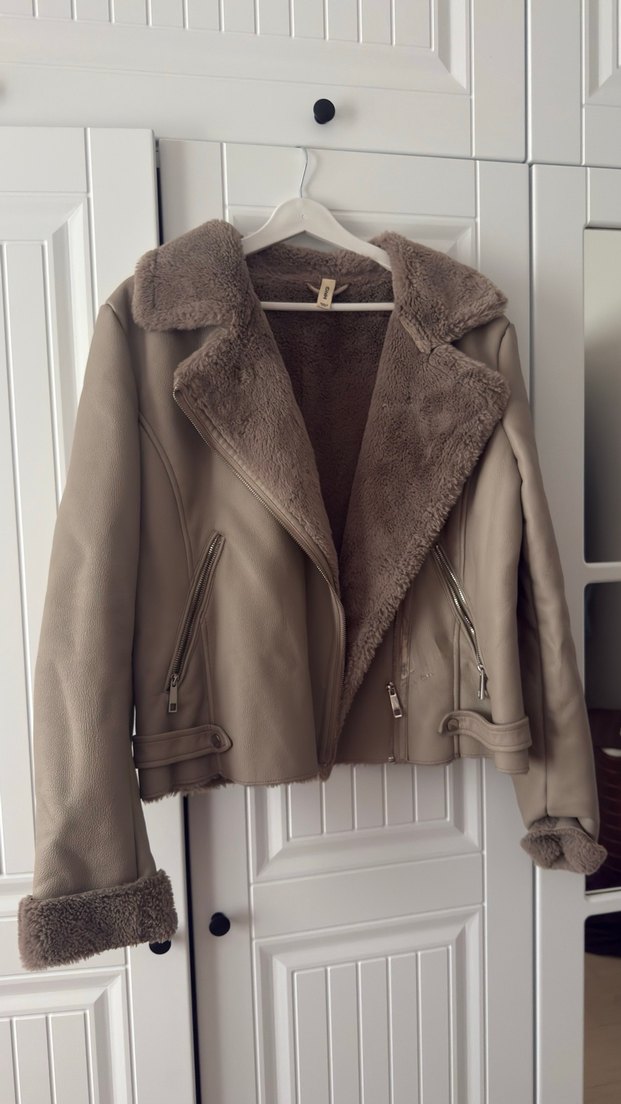 Kürk detaylı, bej deri kadın ceket. Normal boyda, uzun kollu ve keskin yakalı, rahat ve şık kullanıma uygun.