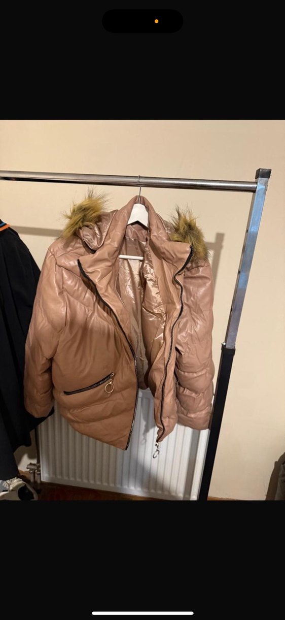 Kürk Detaylı Bej Deri Kışlık Kadın Mont-38-42-44-46 Beden
