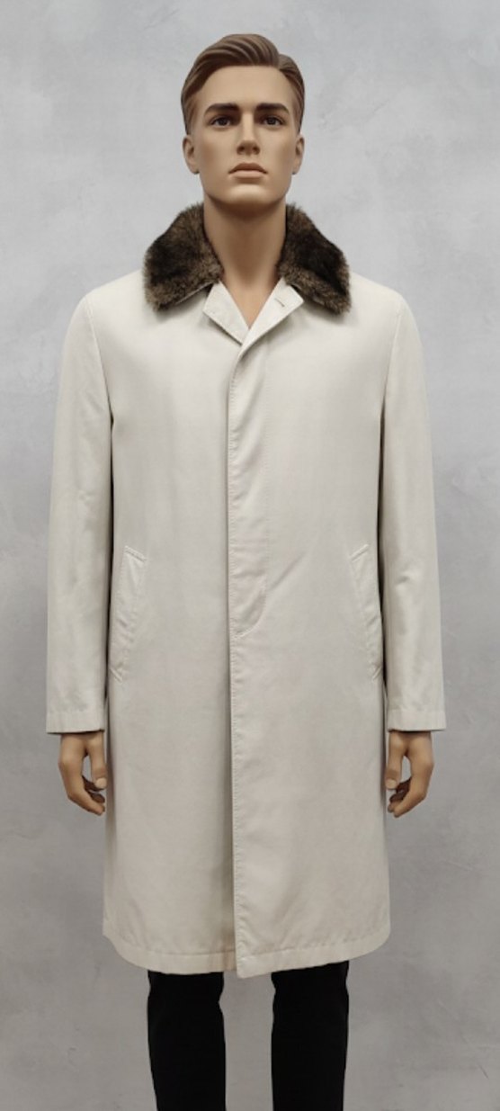 Kürk yakalı, bej renkte, uzun kollu, regular fit klasik erkek kaban. Yumuşak dokulu kumaştan, desensiz ve midi boyda, ofis kullanımı için uygun.
