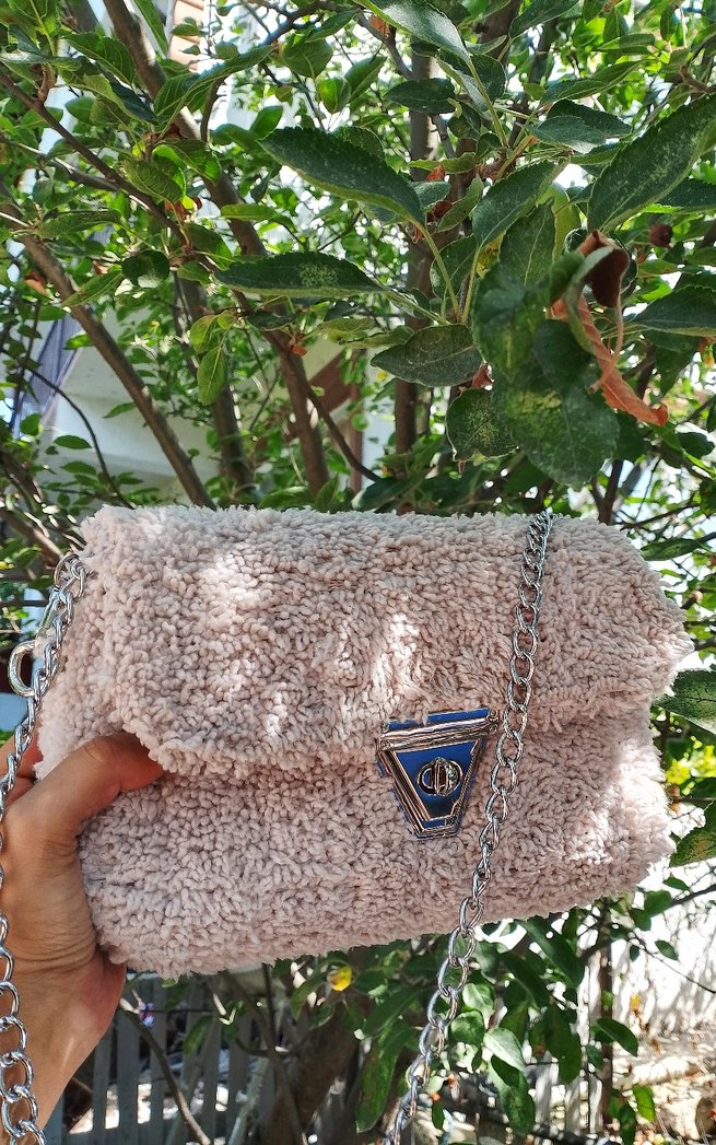 Kadınlar için yumuşak tüylü kumaş ve kürk detaylı, gümüş zincir askılı bej renkli çanta. Bohem ve retro sokak tarzına uygundur.