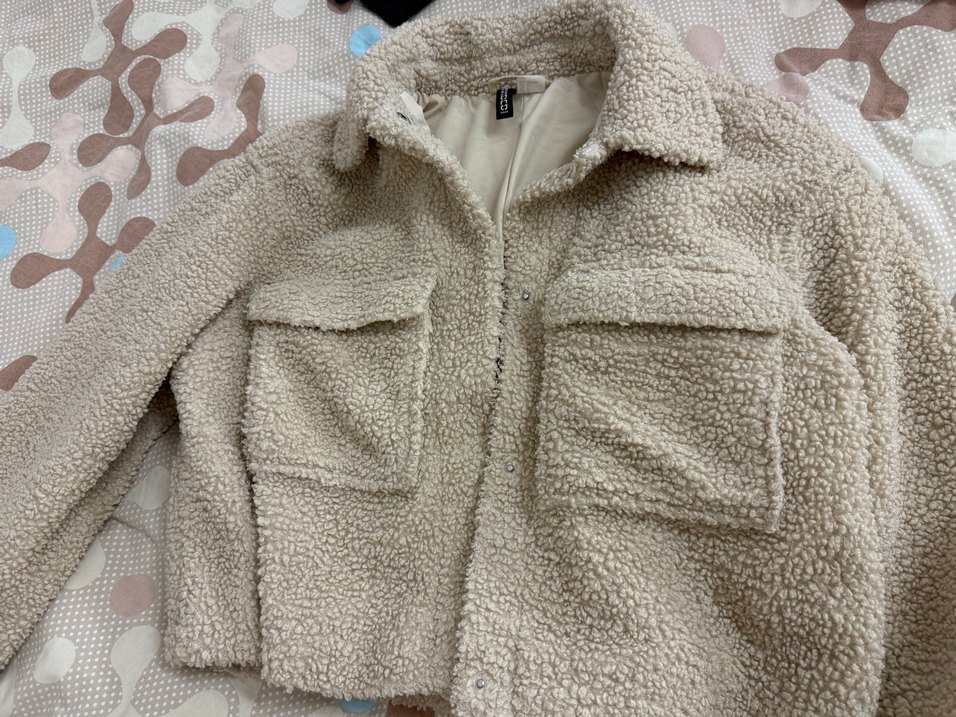Kürk detaylı, bej renkte, uzun kollu ve normal boy midi kadın ceket. Rahat bol kesim ve sokak stiline uygun tasarım sunar.