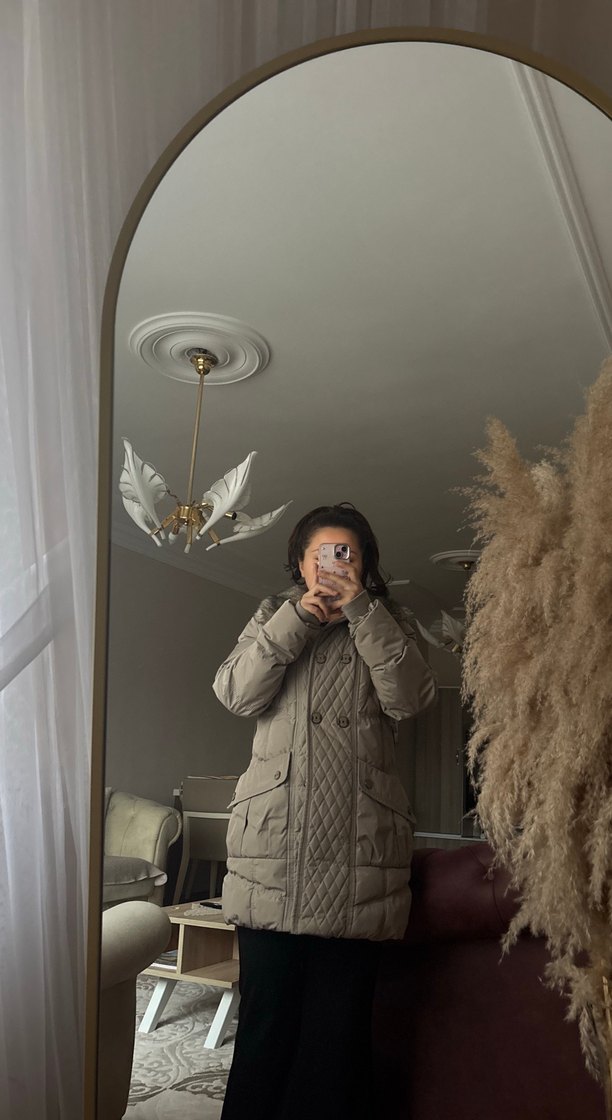 Bej renkli, kürk detaylı yakaya sahip kadın kışlık ceket. Uzun kollu, normal kesim ve midi boyda, yumuşak sentetik kumaştan üretilmiştir.