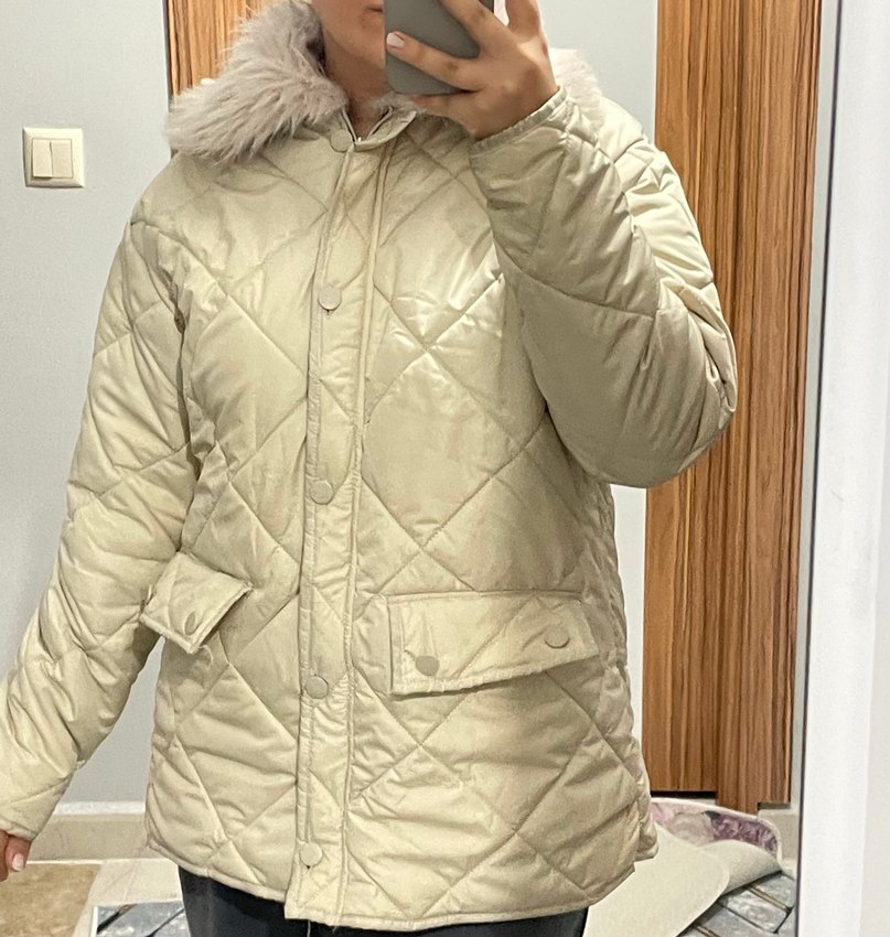 Bej renkte, kürk detaylı yaka ve uzun kollu, normal boyda, sentetik kumaştan kadın kışlık mont. Rahat kesim Standart beden
