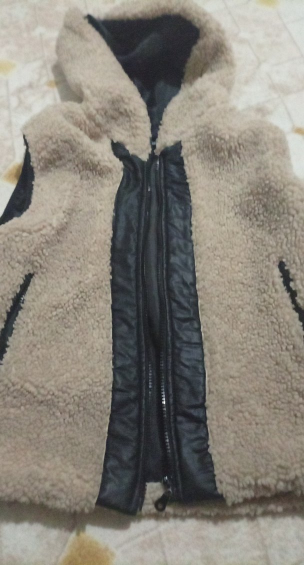 Kürk detaylı, kolsuz ve uzun kesimli bej mont, yumuşak kumaş ve koyu renk detaylarla biker tarzı sunar. Outdoor kullanım için uygundur. ❄️