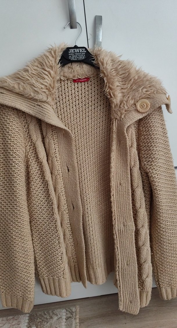 Kürk detaylı kapüşonu, uzun kollu ve bol kesimli bej örme midi hırka. Bohem tarzıyla günlük kullanıma uygun.