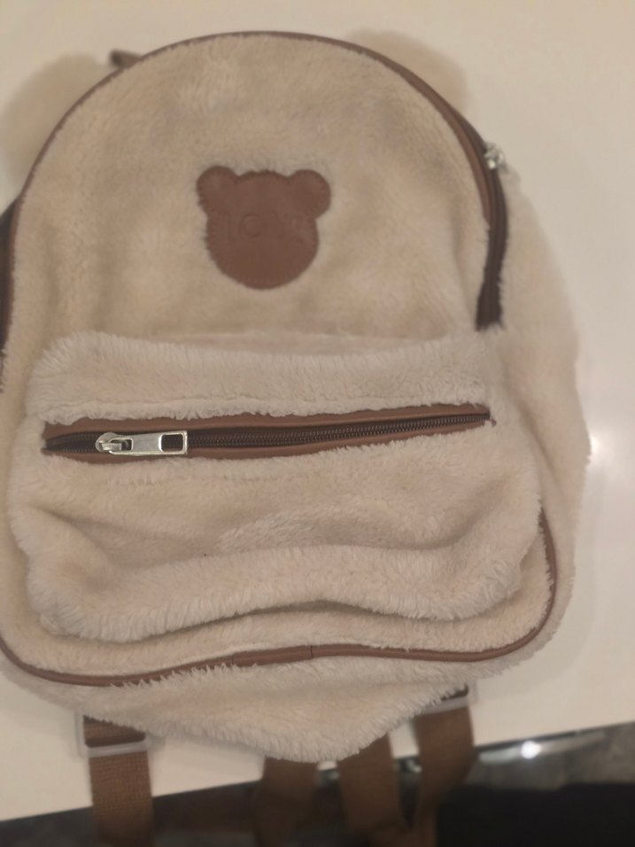 Yumuşak kürk detaylı, ayı figürlü bej kadın sırt çantası. Önünde fermuarlı cep ve ayarlanabilir askılar bulunur.