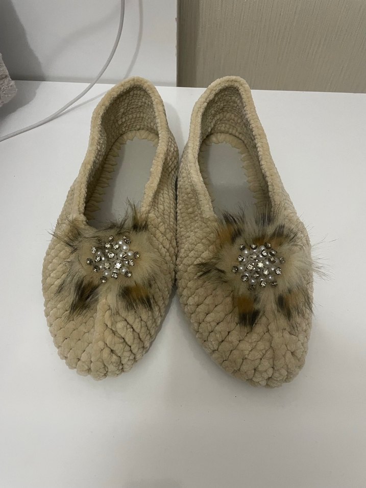 Bej renkli örgü kadın terlikleri, kürk detayları ve taş süslemeleriyle günlük kullanıma uygun rahat ve şık bohem tarzı sunar. 38 39 uyumludur