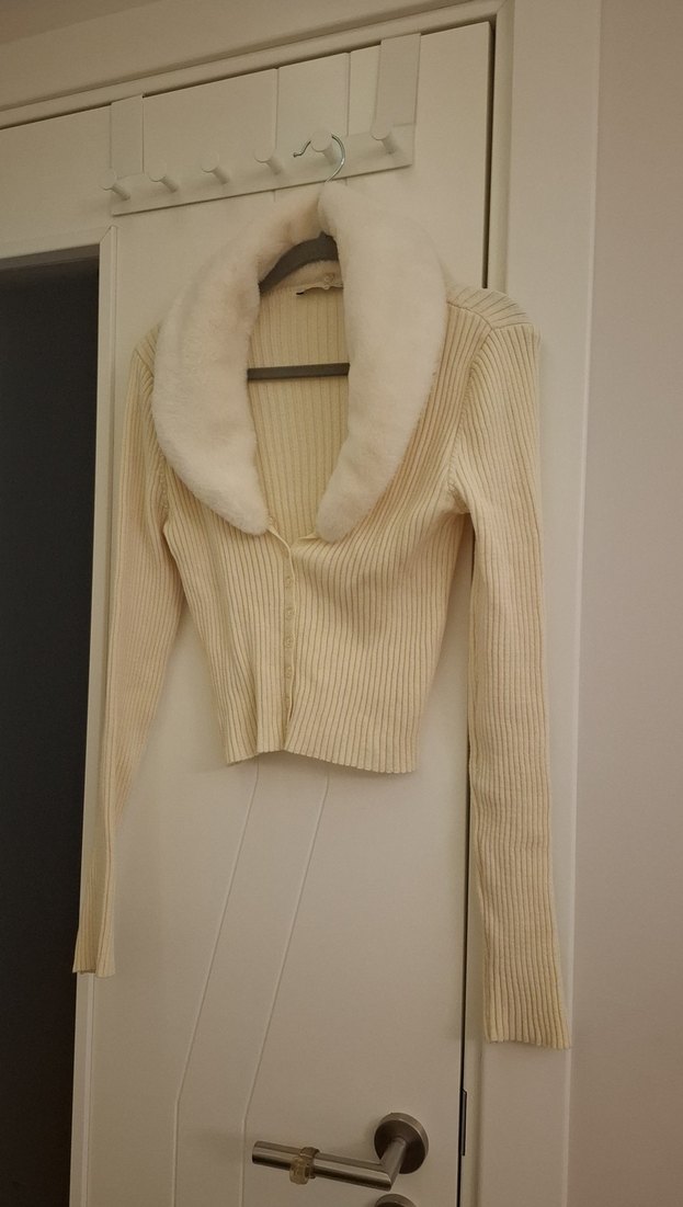 Bej renkte, kürk detayı çıkarılabilir -düğmeli, kadın triko hırka. Uzun kollu, vücuda oturan ve normal boyda, rahat sokak tarzına uygun bir model.