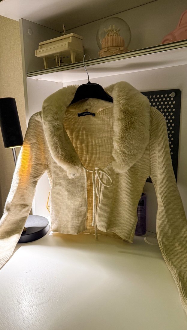 Uzun kollu, kürk detaylı yaka ve bej renkte, triko kumaştan yapılmış, normal midi boyda, desen içermeyen dar kesim kadın kazak.