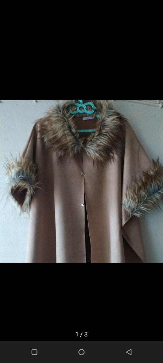 Bej renkli kadın uzun kaban, kürk detaylı yakası ve kollarıyla, bol kesim ve yakalı tasarıma sahiptir, günlük kullanım için uygundur.