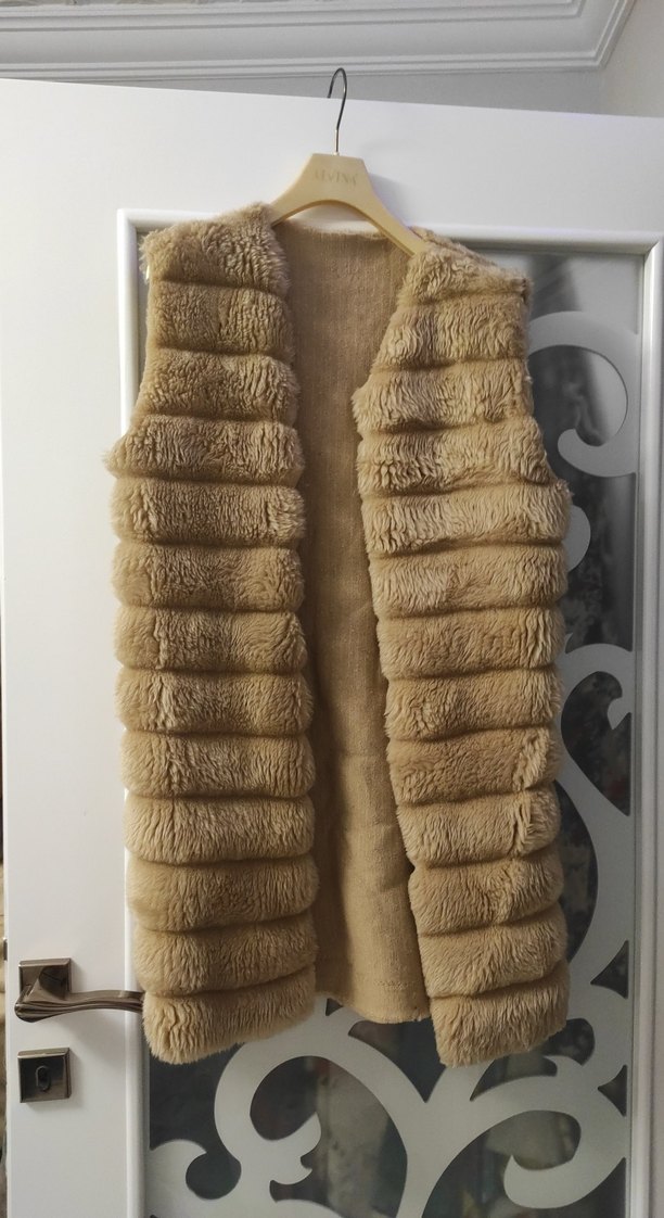Kürk detaylı, bej renkli, kolu olmayan yelek. Yumuşak sentetik kumaştan, uzun boy ve regular kesimle günlük kullanıma uygun.
