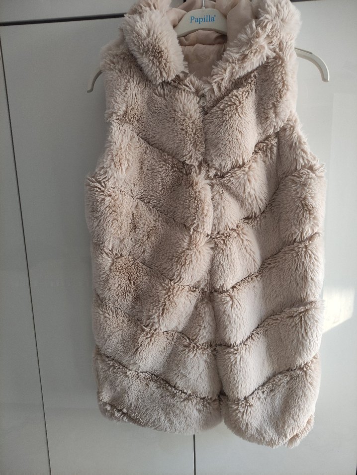 Yüksek yakalı, kürk detaylı, bej renkli, kolsuz kadın yelek. Rahat ve sıcak bir dokunuş sunar, günlük kullanım için uygundur. yaka etiketi kuru temizlemeden ötürü çıkmıştır