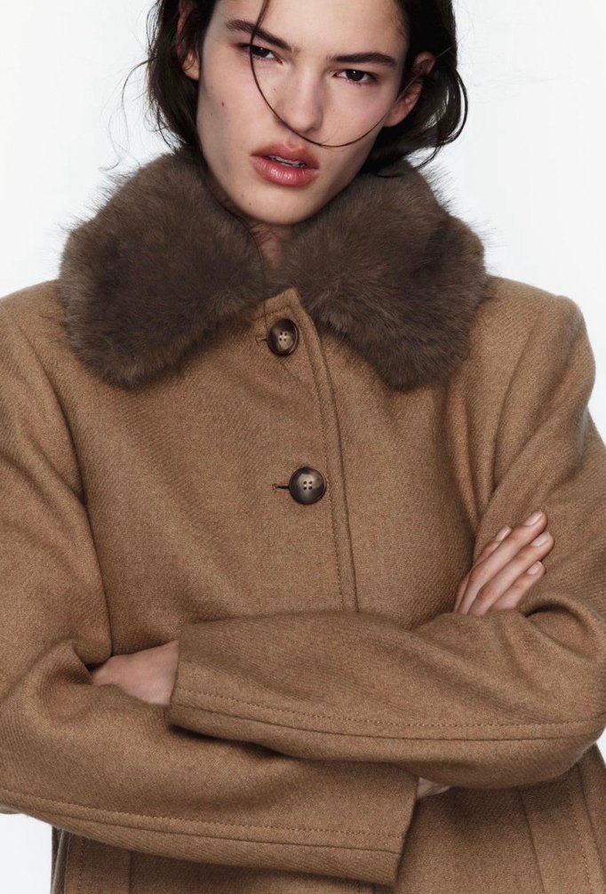 Bej yün kaban, kürk detaylı kesik yaka ve uzun kolludur. Normal kesim ve midi boyda, günlük kullanım için uygundur. Parlak ve düzgün dokulu. 3 4kere anca giyilmiştir hiçbir kusuru yoktur