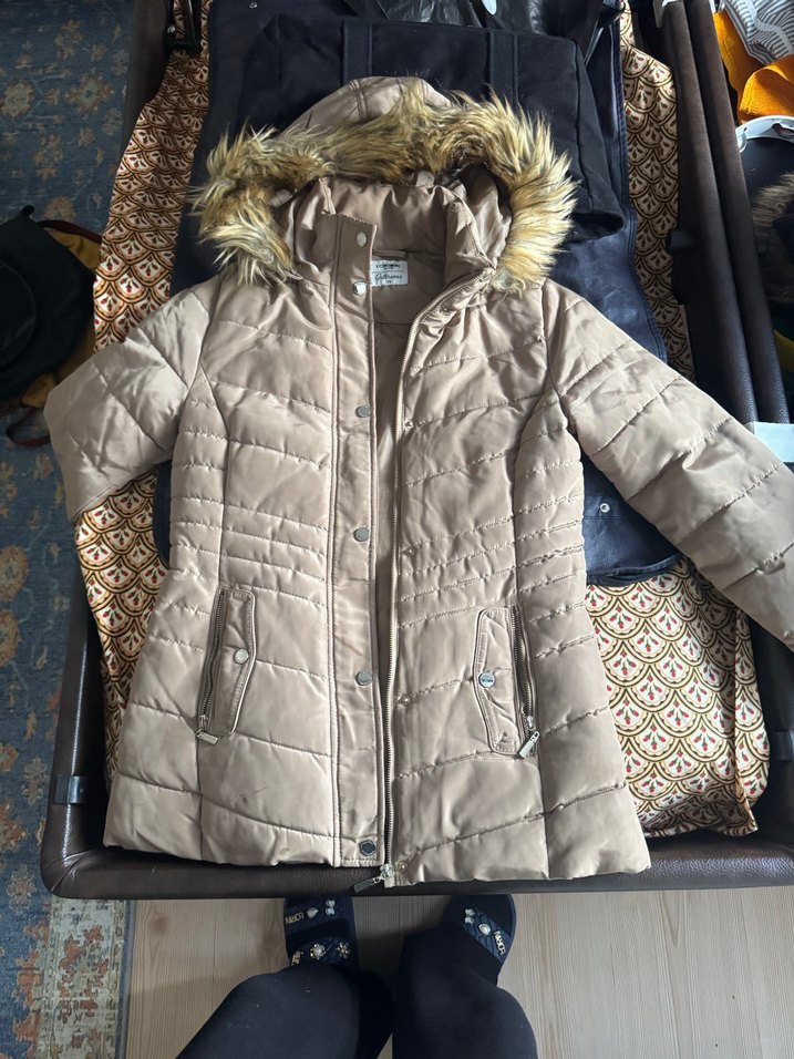 Bej renkte, kürk detaylı kapüşonlu, uzun kollu, dar kesim kadın kışlık mont. Yumuşak ve sıcak kumaştan, günlük rahat sokak stili için uygun. ❄️ sol fermuarı bozuk, sağ cep altında hafif lekeler var. Bir iki kere giyildi. Temiz ürün