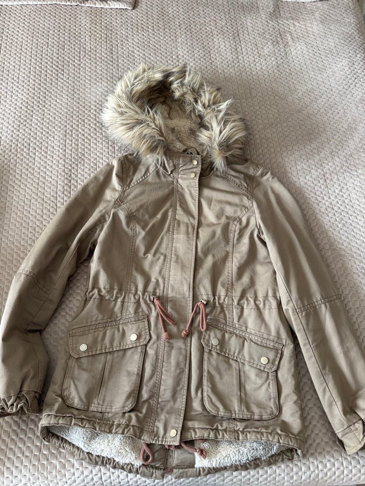 Kürk detaylı kapüşonlu, notched lapel yakalı, bej renk midi uzunlukta, sokağa uygun, cep detaylı, fitted kesim kadın mont.