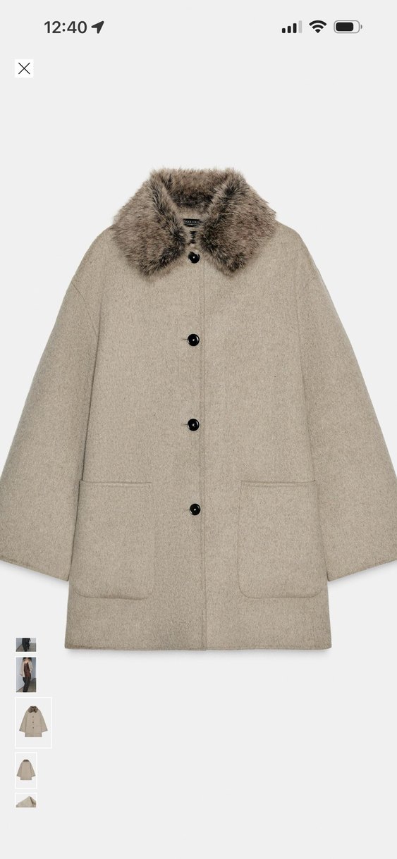 Bej renkte, kürk detaylı yakaya sahip, uzun kollu yün kaban. Normal kesim ve midi boyda, ön cep detayları bulunur. Ofis için uygun bir model.
