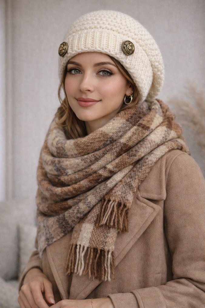 Bej renkli, kürk detaylı ve örgü dokulu yün bere, bohem tarzıyla şık ve rahat bir görünüm sunar.