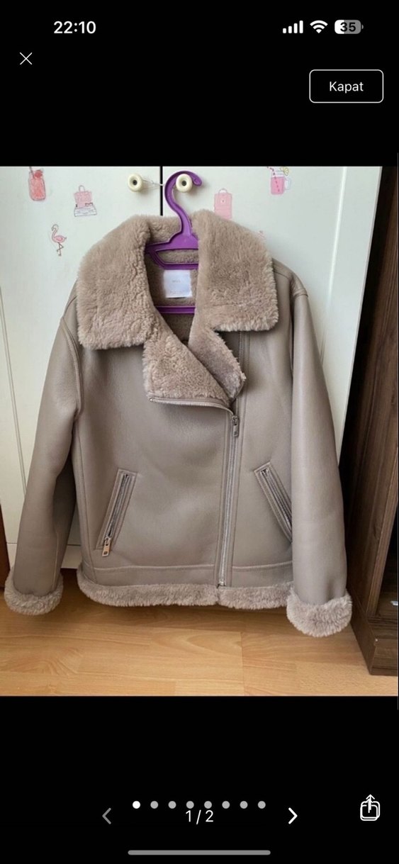 Bej-gri tonlarda süet malzemeden, kürk detaylı, uzun kollu ve geniş kesim kadın ceket. Kısa boy ve desen içermeyen model, günlük kullanım için uygundur.
