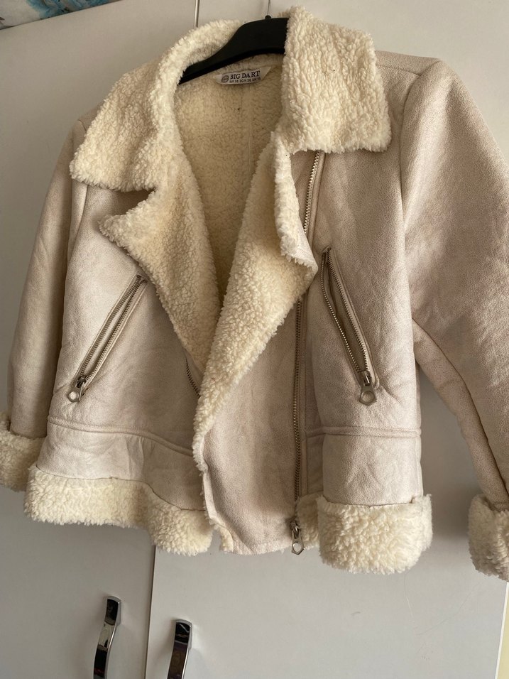 Bej süet kısa mont, kürk detaylı yaka, manşet ve etek ucu ile. Çıtçıtlı yakalı, dar kesim, fermuarlı cepler içerir. Günlük kullanım için uygundur.