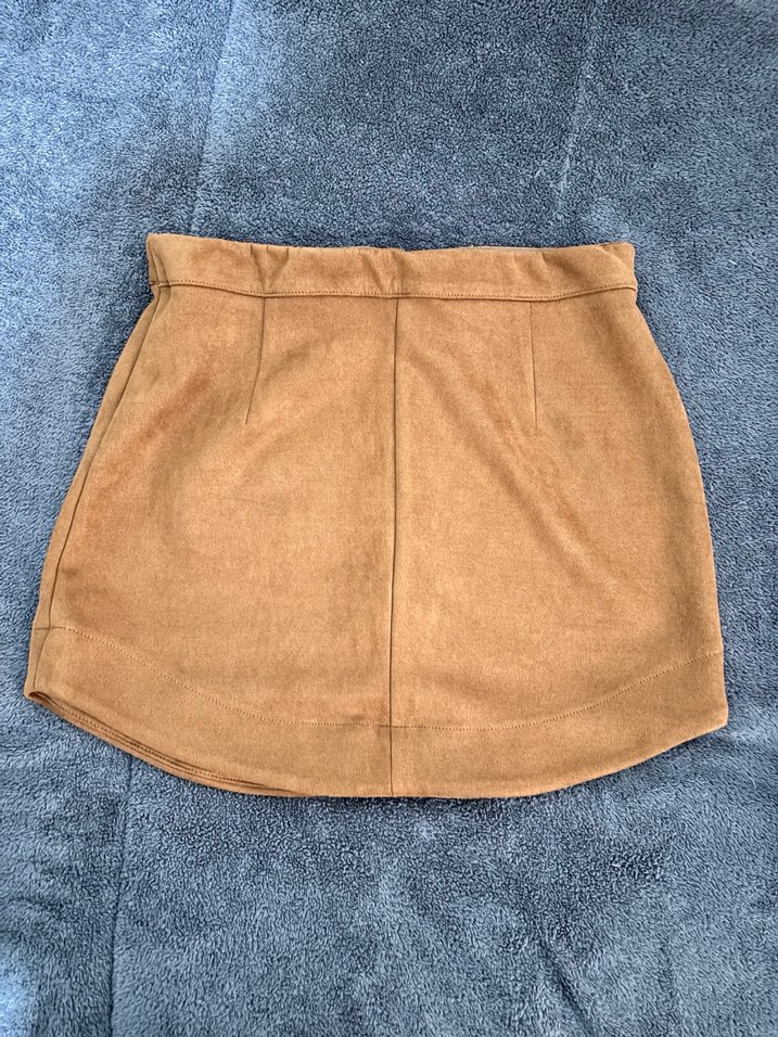 Yumuşak süet kumaştan, kürk detaylı, bej renkli ve dar kesim mini etek. Rahat ve sade sokak stili için uygundur.
