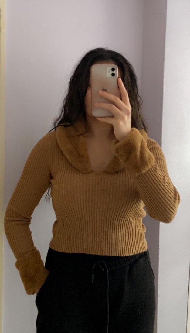 Kürk detaylı, yakalı ve uzun kollu camel triko kazak, şık ve rahat bir sokak stili sunar. Yaka detayı çıkarılıp takılabilir.