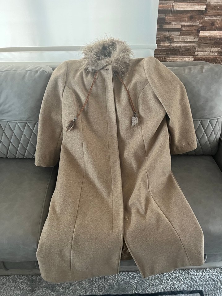 Kürk Detaylı Bej Uzun Kadın Kaban