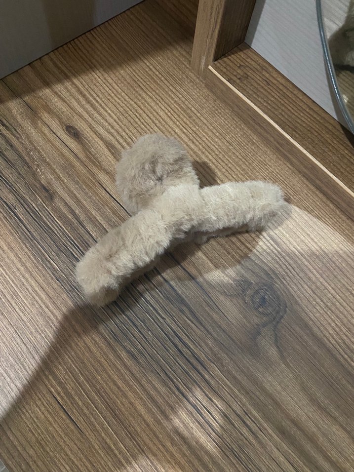 Yumuşak kürk detaylı bej yün saç tokası, rahat ve bohem tarzda sade görünümler için uygundur.