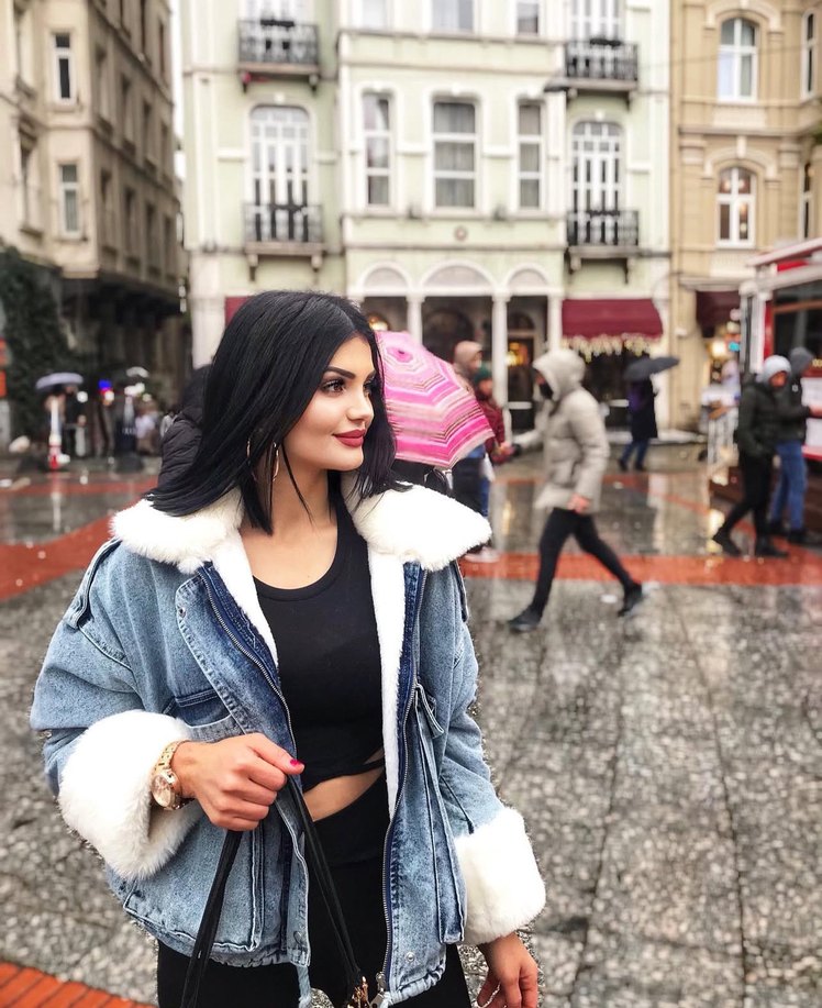 Kürk detaylı, straplez yaka ve bol kesim beyaz batik desenli kot ceket, günlük kullanıma uygundur.