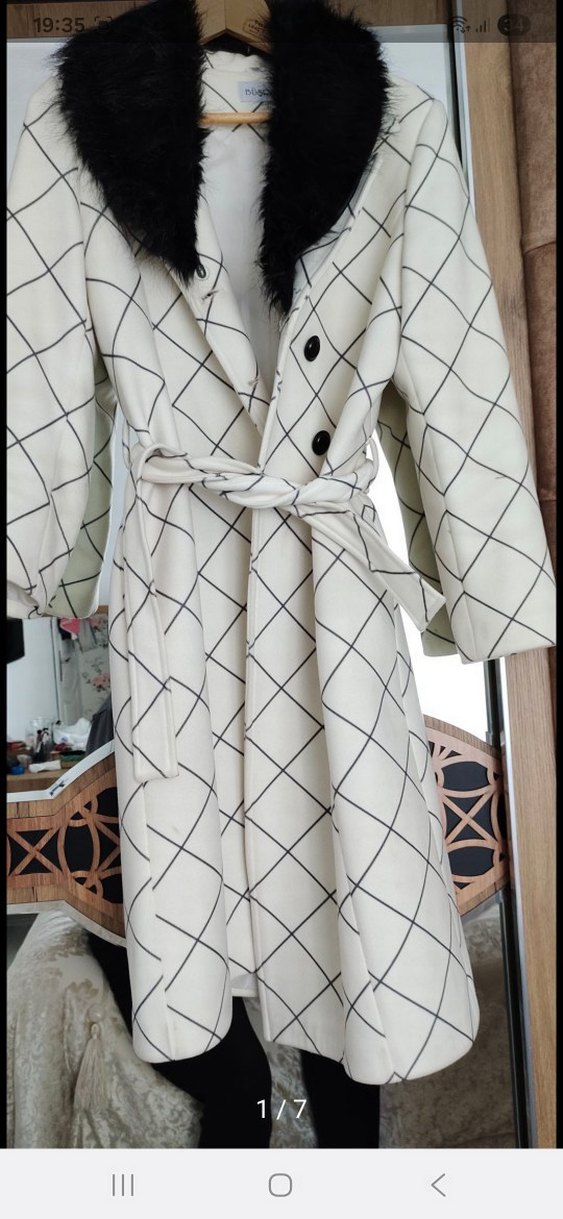 Uzun beyaz ekose desenli kaban, kürk detaylı yakaya sahip. 48 yaziyor etiketinde ama kalıbı küçük 40-42 giyen birine olur